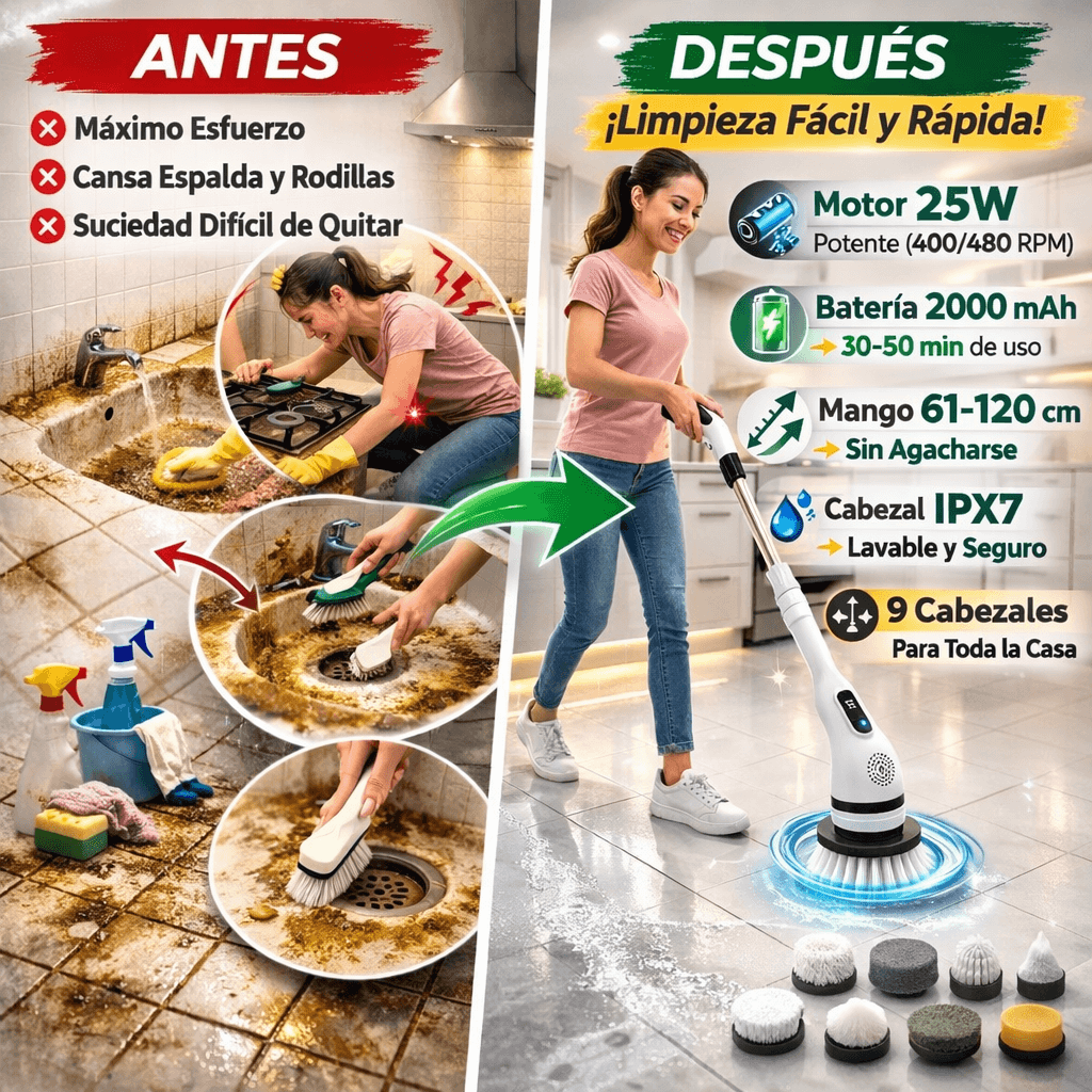 Incluye 9 cabezales intercambiables para baño, cocina, pisos, vidrios y rincones difíciles.